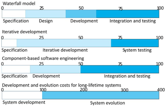 - Requirement definition과 design 단계에서 약 40%, implementation 20%, test와 유지 보수가 40%의 비용을 차지한다.